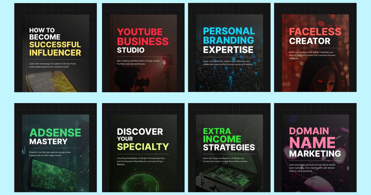 احصل على 8 كتب إلكترونية جاهزة للبيع (باللغة الإنجليزية) مع حقوق كاملة للبيع والتعديل. يمكن بيعها بلا حدود مقابل دفعة واحدة فقط
